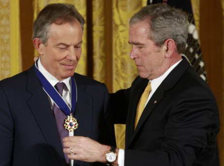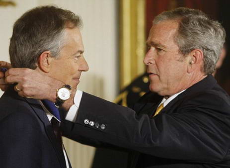 據(jù)英國《每日郵報》報道,美國總統(tǒng)布什13日向英國前首相布萊爾頒發(fā)了總統(tǒng)自由勛章。這一勛章是美國授予平民的最高榮譽。