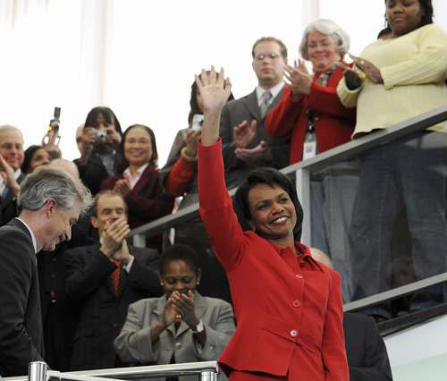 美國國務(wù)院十六日舉行了一場告別會,國務(wù)院全體職員均有出席。會上國務(wù)卿賴斯發(fā)表了一段主題為保衛(wèi)全球自由民主的重要性的簡短演說。然后,她向下屬們說:“你們永遠都會留在我的腦海里、我的禱告里和我的心里。”當時她面露微笑,但眼里泛著淚光,而且說話的聲音哽咽。語畢,臺下向她報以熱烈的歡呼和掌聲,她則步下臺階,與各個大使、外交官、安全官員等逐一握手并拍照留念,然后步出大門。