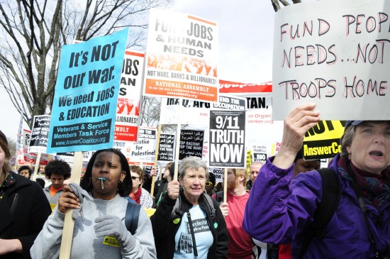 來自美國各地和各個民間組織的數(shù)千名反戰(zhàn)人士21日聚集在美國首都華盛頓,舉行名為“向五角大樓進(jìn)軍”的游行示威活動,紀(jì)念伊拉克戰(zhàn)爭爆發(fā)六周年,要求美國政府立即從伊拉克和阿富汗撤軍。