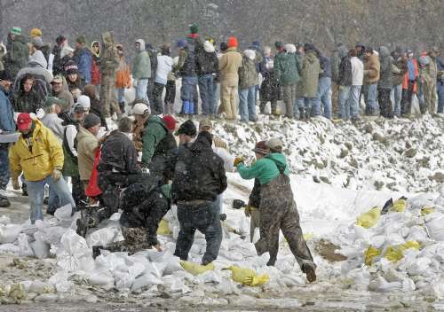 在27日早上,法戈市大約150戶居民已經(jīng)撤離,一些醫(yī)院、診所和學(xué)校也關(guān)閉,而數(shù)千名志愿人員及1700名國民警衛(wèi)軍冒寒堆放沙包,加固城市周邊的防洪帶,并準(zhǔn)備在防御物發(fā)現(xiàn)裂縫后作出通報(bào)。另外,在明尼蘇達(dá)州穆爾黑德市,約2660戶居民要緊急疏散。法戈市市長瓦拉克說,他們正在集中力量,全力搶救能夠保護(hù)的每件財(cái)產(chǎn)。法戈變成澤國的風(fēng)險(xiǎn)十分高,因?yàn)樵撌形从邪l(fā)展上游區(qū)域城市的周延大型防洪系統(tǒng)。另外,北達(dá)科他州政府亦用炸藥炸開堵塞的冰塊,以疏通受阻而淹沒該州的洪水,并出動(dòng)救難艇和直升機(jī)救出受困在各地的災(zāi)民。