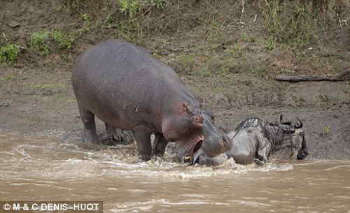 盡管那只黑尾牛羚看起來在劫難逃,不過,很顯然,它最終逃過了河馬的攻擊。攻擊事件發(fā)生在肯尼亞馬塞-馬拉國家公園的馬拉河河岸。黑尾牛羚當(dāng)時正和其它150萬只黑尾牛羚行進(jìn)在大遷徙的最后一段路程上,它們?yōu)閷ふ倚碌牟莸貜奶股D醽喅霭l(fā)前往肯尼亞。