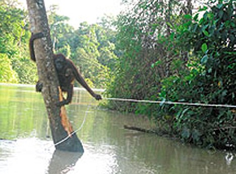 長期以來人們相信大猩猩是怕水的,但是這只母猩猩根本就沒有猶豫。這只大猩猩抓住繩子,背上自己的幼兒,在水中奮力滑動,游至岸邊。在水里的時候,她始終努力保證小猩猩的頭部在水上。
