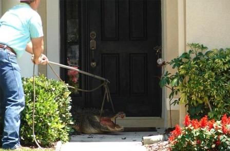 中新網(wǎng)4月29日電 據(jù)英國媒體報(bào)道,日前在佛羅里達(dá)州郊區(qū)的一家住戶門外驚現(xiàn)一條長達(dá)11英尺的鱷魚,這家主人被困屋內(nèi)緊急報(bào)警,野生動(dòng)物專家用了一個(gè)小時(shí)才把這位“不速之客”請(qǐng)走。
