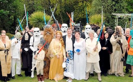 這對新人邀請了50名賓客在懷特島舉行了婚禮,他們打扮成 “絕地武士”和“帝國士兵”,而分別裝扮成萊婭公主以及漢•索洛的新娘和新郎才是當(dāng)天真正的主角。