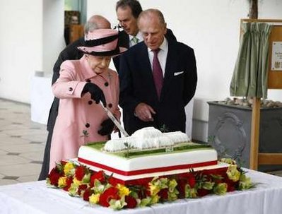 5日女王和其丈夫到英國“巧園植物園”出席巧園成立250周年慶祝會。園方準(zhǔn)備了一個長方形大蛋糕,下面是鮮花,上面是白色奶油。頂上做成巧園最有名的建筑,大溫室的樣子。蛋糕店老板把刀交給女王。女王一拿起刀,菲利普就在旁邊說,“好好切,用點力”。