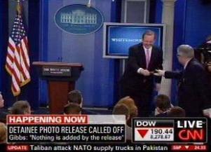 據(jù)美國媒體5月13日報道,白宮13日中午舉行的新聞發(fā)布會進行的很激烈,美國有線電視新聞網(wǎng)記者埃德-亨利、美國廣播公司記者杰克-塔皮爾和其他記者紛紛對白宮發(fā)言人吉布斯提出尖銳問題,質(zhì)疑奧巴馬總統(tǒng)13日作出的將設法阻止公布美軍虐囚照片的決定。不過,發(fā)布會的緊張氣氛由于手機鈴聲多次響起而得以在短時間內(nèi)得到緩解。