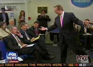 三家主要的有線電視臺都實況轉播了白宮新聞發(fā)布會。《人事》雜志記者約翰-吉茲的手機首先傳出鈴聲。吉布斯在聽到鈴聲后稱:“請放至震動,我們以前也是這樣作的!碑斒謾C再次發(fā)出聲音后,吉布斯走下講臺,要求吉茲交出手機,他隨后把手機扔給站在房間后面的一位助手。就在吉布斯回到講臺,開始回答一個問題時,美國哥倫比亞廣播公司記者比爾-普朗特的手機又響了起來。已負責報道白宮事務25年的普朗特拒絕了吉布斯交出手機的要求,他離開了房間,人們發(fā)出一陣笑聲,普朗特五分鐘后回到他的前排座位。