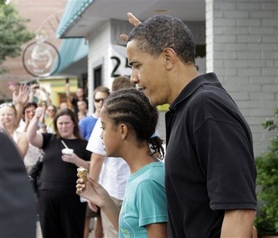 據(jù)臺灣中廣新聞網(wǎng)報(bào)道,這個星期天是美國的父親節(jié),奧巴馬在父親節(jié)前夕,忙里偷閑,在悶熱的午后,帶著兩個女兒去吃冰,他似乎短暫拋開了對食物熱量的警覺,大吃澆了糖霜以及杏仁的冰淇淋,第一千金也各自點(diǎn)了不同的冰品,父女三人在餐廳大約停留了15分鐘,奧巴馬還和店內(nèi)顧客握手拍照,臨走又買了一些狗點(diǎn)心,要帶回去犒賞第一家庭的寵物狗。