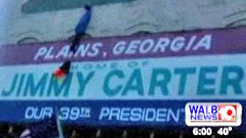據(jù)香港大公網(wǎng)報(bào)道,那是一個(gè)巨大的黑色假人,外貌酷似奧巴馬,頸部纏著一條繩,被人吊在平原鎮(zhèn)大街一幢建筑物外面。那座建筑物的外墻掛了一幅巨型橫額,印上“佐治亞州平原鎮(zhèn),我們的第三十九任總統(tǒng)卡特的故鄉(xiāng)”的字句。