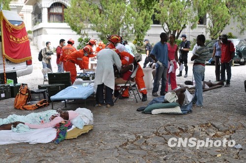 海地當(dāng)?shù)貢r間14日9時,中國武警總醫(yī)院赴海地國際救援醫(yī)療分隊開設(shè)第一個流動醫(yī)療點,已為110名受傷的災(zāi)民提供醫(yī)療救助。海地總理禮賓官趕到醫(yī)療救助點,他握著來自中國武警總醫(yī)院的醫(yī)生的手說:“感謝中國國際救援隊,你們是第一支來總理府進行人道主義救助的救援隊”。