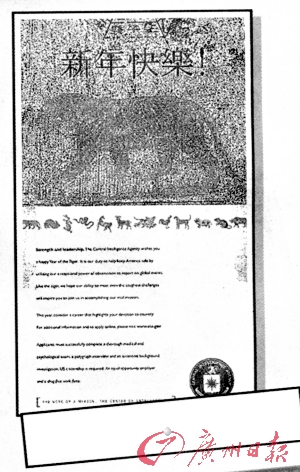 CIA還首度以中文“新年快樂(lè)”向華裔民眾拜年,廣告畫面上還配有一只威風(fēng)凜凜的老虎,中國(guó)味濃厚,備受矚目。
