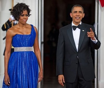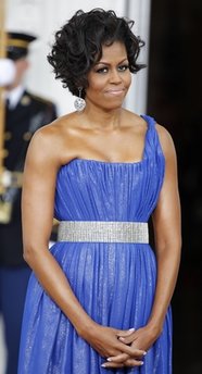 當晚,奧巴馬夫人米歇爾再次閃亮登場,其著裝打扮又被眾媒體拿來評點一番。米歇爾穿了亮藍色單肩拖地長裙,腰間系上銀色腰帶,并佩戴了銀色耳環(huán)。
