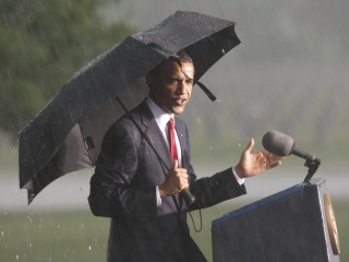 5月31日下午,奧巴馬準(zhǔn)備在林肯國(guó)家公墓發(fā)表國(guó)殤日演說,正當(dāng)他站上講臺(tái)之際,天空中忽然下起大雨,一時(shí)間雷電交加,風(fēng)也狂吹,一旁的旗幟不停左右搖擺。由于雷雨越下越大,完全沒有趨緩,奧巴馬撐著一把大黑傘,宣布演說暫時(shí)取消。