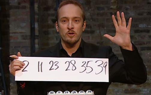 英國電視臺現(xiàn)場直播了當(dāng)期彩票的開獎過程,由機器隨機選擇箱子中的球。而在另一個演播室,放置了一臺電視播放開獎過程。這位身處另一演播室的神秘“幻術(shù)師”在結(jié)果出來之前,就背對電視寫下了一組數(shù)字,分別是2、11、23、28、35和39。結(jié)果證實,他所預(yù)測的數(shù)字與中獎結(jié)果完全一致,令人瞠目結(jié)舌。