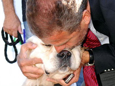 據(jù)克羅地亞“新聞”網(wǎng)站報(bào)道,當(dāng)?shù)財(cái)z影師杜布拉夫科·瓦圖茨拍攝下了這一幕。當(dāng)時(shí)這位現(xiàn)任的薩格勒布市市長(zhǎng)雙手緊緊抱住金毛的脖子并“強(qiáng)吻”,這一反常舉動(dòng)不僅讓周圍的人們吃驚,也嚇壞了原本溫順的金毛,緊接著便出現(xiàn)了戲劇性的一幕。