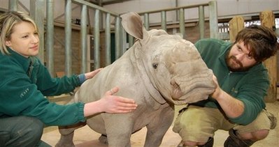 據(jù)報(bào)道,2009年12月21日,英國(guó)愛丁堡北部的布萊爾德拉蒙德野生動(dòng)物園(Blair Drummond Safari Park)接到一個(gè)匿名電話,電話那端的女子表示,自己是塞浦路斯人,在通過(guò)網(wǎng)絡(luò)攝像頭看動(dòng)物園的實(shí)時(shí)拍攝情況時(shí)發(fā)現(xiàn),一只懷孕已經(jīng)16個(gè)月的犀牛媽媽即將臨盆。