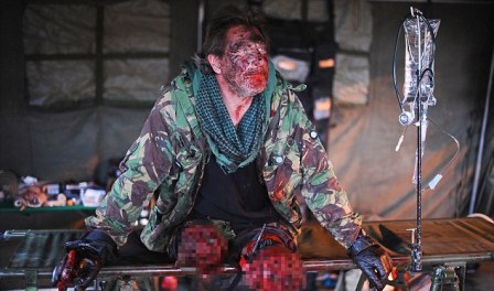 借助涂抹假血等化妝技術(shù),斯威夫特看上去就像是一名剛剛在爆炸中嚴(yán)重受傷的士兵。他雙腿齊刷刷地?cái)嗟,斷腿裹著的繃帶滲出血跡,周圍還掛著被炸爛的肉、皮,有的地方骨頭還露了出來。
