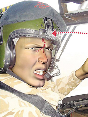 當(dāng)時塔利班分子的攻勢很激烈,直升機(jī)盤旋良久才逮到一個交火較少的機(jī)會降落下來,不過當(dāng)傷員陸續(xù)登上直升機(jī)時,對手的襲擊又開始活躍起來。當(dāng)傷員接載完畢,伊恩冒著彈雨再起飛時,一粒子彈剛巧擊中他的頭盔前部一塊用于安裝夜視鏡的金屬架,子彈從這里穿透了頭盔,射中他的眉心。鮮血從伊恩的額頭涌了出來,一直流到他的眼睛。此時更多的子彈射了進(jìn)來,支奴干的控制臺被擊中,穩(wěn)定系統(tǒng)無法工作。但伊恩仍然努力控制直升機(jī),繼續(xù)飛行了大約8分鐘,順利降落基地。空軍消息人士說,如果子彈射低一毫米,又欠缺這位機(jī)師的駕駛技術(shù),機(jī)上所有人相信無機(jī)會生還。