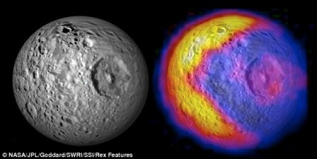 據(jù)報(bào)道,繞著土星軌道飛行的“卡西尼”號(hào)飛船近日拍下一幅關(guān)于土星的衛(wèi)星——土衛(wèi)一“米瑪斯”(Mimas)星球表面熱量分布的圖片,圖片顯示該衛(wèi)星熱量分布很不均勻?茖W(xué)家認(rèn)為,這是由于其表面構(gòu)成成分的差異所造成的。