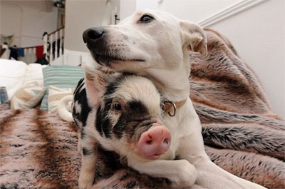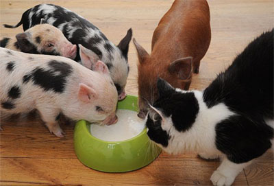 克羅夫特家的寵物“長(zhǎng)老”是狗狗黛西和貓咪?送校@一狗一貓都不是吝嗇的小動(dòng)物,它們?cè)敢夂兔阅阖i們分享自己的一切,包括床和食物。因此常?梢(jiàn)小豬們和貓咪躺在一起睡覺(jué)、一起喝牛奶;或是看到小豬黏在狗兒黛西身上,相互依偎。有時(shí)候好幾只豬集體霸占黛西的睡床,它寧愿看著小豬熟睡,自己卻坐得直挺挺地,不敢吵醒它們。
