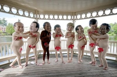 來自加拿大樂施會組織的幾名成員裝扮成八國首腦,他們帶上奧巴馬、默克爾等領(lǐng)導(dǎo)人的面具,身穿肉色緊身衣,看上去仿佛“赤身裸體”,而關(guān)鍵部位則用一片加拿大特有的紅葉遮羞。他們在鏡頭前搔首弄姿、大擺pose,欲以此嘲諷G8峰會。