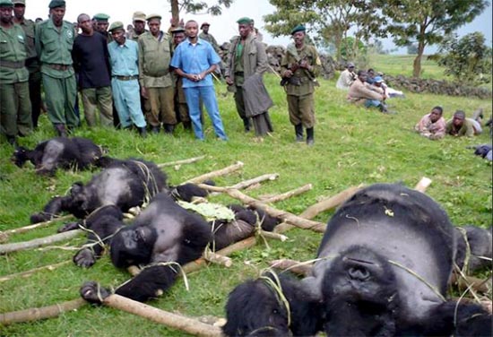 僅2007年6、7兩月就有7頭大猩猩被屠殺,而一頭名為Senkwekwe、重達(dá)500磅的銀背大猩猩的遇害照片更令村民們悲痛不已。除200只珍稀猩猩被殺害,森林砍伐加速,自然資源流失,更令人發(fā)指的是,過(guò)去10年共有150多名護(hù)林隊(duì)員在剛果民主共和國(guó)東部地區(qū)的五個(gè)公園中被謀殺。