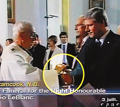 據(jù)香港文匯報報道,哈珀上周出席加拿大前總督勒布朗的天主教葬禮,流傳在YouTube上的電視畫面顯示:哈珀領(lǐng)了圣餐(見圖),但鏡頭停留的數(shù)秒鐘中,都沒有哈珀把圣餐餅放入嘴中的動作。