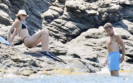 媒體拍到他們?cè)诤_呌斡镜恼掌。這位注重身材的法國(guó)總統(tǒng)站在水中盡力收腹,健康問(wèn)題看似已無(wú)大礙。布呂尼則戴著太陽(yáng)帽和墨鏡,穿著黑色比基尼,大秀身材。他們并沒(méi)有進(jìn)行激烈的運(yùn)動(dòng),有記者只是看到他們?cè)谒谢ハ嘤H吻。