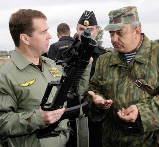 電視畫面顯示,梅德韋杰夫身著海軍夾克。《每日電訊報(bào)》報(bào)道,軍服上有徽章顯示“D.A. 梅德韋杰夫,俄羅斯聯(lián)邦武裝部隊(duì)總司令”,軍服上還有一面小的俄羅斯國旗。在演習(xí)現(xiàn)場(chǎng),梅德韋杰夫端起一把機(jī)槍,饒有興致地查看各種裝備,并不時(shí)同俄羅斯軍隊(duì)高官交談。
