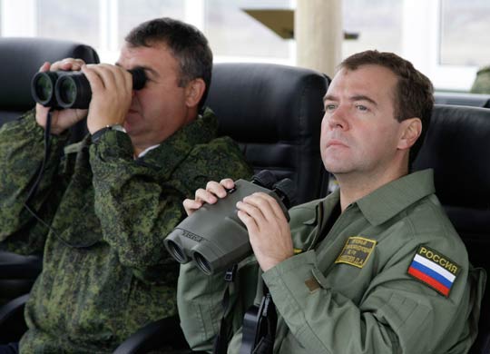 據(jù)英國《每日電訊報(bào)》28日?qǐng)?bào)道,近日,俄羅斯正同白俄羅斯在加里寧格勒地區(qū)展開聯(lián)合軍事演習(xí)。俄羅斯總統(tǒng)梅德韋杰夫也身著軍裝出現(xiàn)在演習(xí)現(xiàn)場(chǎng),他甚至端起一把機(jī)槍,并且用雙筒望遠(yuǎn)鏡觀看演習(xí)情況,展現(xiàn)自己的硬漢形象。