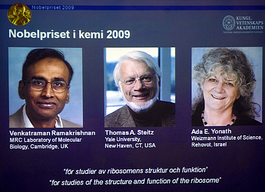 萬卡特拉曼-萊馬克里斯南出生于1952年,來自英國醫(yī)學(xué)研究委員會劍橋分子生物學(xué)實驗室;托馬斯-施泰茨出生于1940年,來自美國耶魯大學(xué)和霍華休斯醫(yī)學(xué)研究所;1939年出生的女生物學(xué)家阿達(dá)-尤納斯來自以色列霍旺特-魏茨曼科學(xué)研究所。