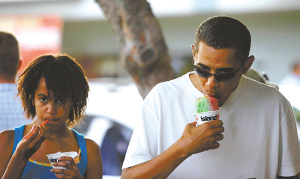 當(dāng)時(shí)跟奧巴馬一起在刨冰店吃冷飲的除了兩個(gè)女兒外還有他的十來個(gè)朋友。美國總統(tǒng)心情顯然不錯(cuò),一邊吃刨冰,一邊拿朋友開涮。由于美國玫瑰碗橄欖球聯(lián)賽當(dāng)天早些時(shí)候剛剛結(jié)束一場比賽,他指著一位朋友告訴記者:“他支持的球隊(duì)輸了,整個(gè)心都碎了,所以我?guī)麃斫o他買刨冰吃!