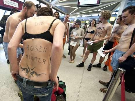 他們身著很少的衣服,一些人還在自己裸露的皮膚上寫著:誰來保護(hù)我們的隱私?他們還在微型博客網(wǎng)站Twitter上寫道:“你們無需對我們進(jìn)行安檢了,因?yàn)槲覀円呀?jīng)赤身裸體了。”