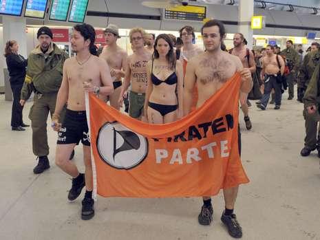 據(jù)德國《圖片報(bào)》1月10日報(bào)道,當(dāng)?shù)貢r(shí)間周日下午,德國“海盜黨”(一個(gè)宣傳保護(hù)個(gè)人隱私的小黨派)的約15名成員在柏林機(jī)場A航站樓半裸抗議政府引進(jìn)更為嚴(yán)格的機(jī)場身體掃描設(shè)備。