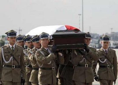 11日,卡欽斯基的遺體在俄羅斯總理普京的目送下,在斯摩棱斯克市機(jī)場(chǎng)被送上返回華沙的飛機(jī)。此前,普京和波蘭總理唐納德•圖斯克在波蘭總統(tǒng)專機(jī)失事現(xiàn)場(chǎng)敬獻(xiàn)鮮花,向遇難者表示哀悼。普京稱斯摩棱斯克空難不僅是波蘭的悲劇,也是俄羅斯的悲劇。