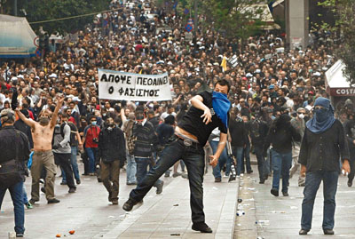 數(shù)萬名來自公職和私營(yíng)兩大工會(huì)的成員昨日走上雅典街頭,高舉“國際貨幣基金組織和歐盟盜走了一個(gè)世紀(jì)的社會(huì)發(fā)展”、“富人需為危機(jī)負(fù)責(zé)”等橫幅,對(duì)政府實(shí)行嚴(yán)厲的財(cái)政緊縮政策表達(dá)不滿。