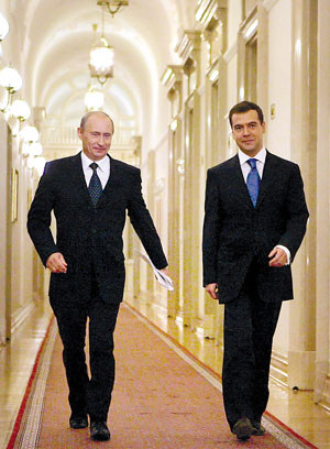 普京在自己的第二任總統(tǒng)任期結(jié)束時欽點(diǎn)梅德韋杰夫作接班人。作為俄羅斯最受歡迎的政治家,普京可望在2012年再度競選總統(tǒng),且如果成功,他可以一直執(zhí)政至2024年。