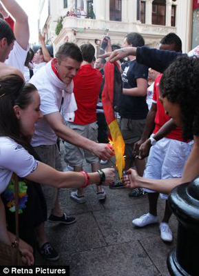 中新網(wǎng)6月28日電 據(jù)英國媒體報道,在英格蘭三獅軍團慘敗給德國新戰(zhàn)車后,一名德國隊支持者遭遇聚集在倫敦萊切斯特廣場觀戰(zhàn)的英格蘭球迷的圍堵。