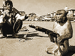 據(jù)英國媒體27日報道,阿富汗的塔利班軍閥們竟想出了一種匪夷所思的方法來對付駐阿盟軍:他們竟將一些愛吃香蕉和花生的猴子訓(xùn)練成了“致命殺手”,教會了這些猴子如何使用卡拉什尼科夫沖鋒槍、布倫式輕機(jī)槍甚至迫擊炮,并教它們?nèi)绾螌iT向穿美軍服裝的士兵發(fā)起襲擊。頗具諷刺意味的是,“訓(xùn)練猴子當(dāng)殺手”的主意最早卻是由美國中情局發(fā)明出來的,美國中情局曾在越戰(zhàn)中發(fā)起“香蕉行動”,專門用花生和香蕉當(dāng)獎品,訓(xùn)練一些“猴子士兵”在叢林中獵殺越南士兵。
