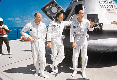 據(jù)香港《文匯報》報道,1969年7月,3名宇航員阿姆斯特朗、科林斯和奧爾德林,擠在“阿波羅11號”里展開他們歷史性的8天旅程。此次紀念登月40周年,周日3人終于有機會再一同出現(xiàn)在公眾面前,并在華盛頓的史密森學會國家航空航天博物館發(fā)表演講,一起談論太空歷史。這或許將是3位年屆8旬的老人,最后一次集體亮相。