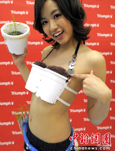 12日,日本東京,模特青山玲子正在展示日本黛安芬公司推出的一款新型內(nèi)衣。這種內(nèi)衣的罩杯是兩個(gè)“花盆”,可以種大米等農(nóng)作物。據(jù)悉,這款內(nèi)衣暫時(shí)不會(huì)在市場(chǎng)上發(fā)行、銷(xiāo)售。
