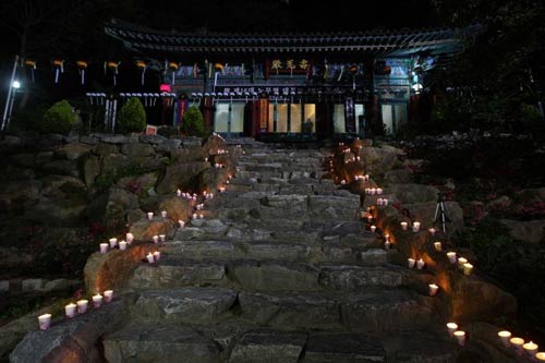 在安放故人骨灰盒的峰火山凈土苑里,從停車場通往法堂的山路兩旁燭光通明。在路口的空地上鋪著長15米、寬1.5米的黃布。約400名吊客在空地上等待著故人。