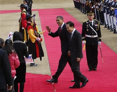 中新網(wǎng)11月19日電 據(jù)路透社報(bào)道,美國總統(tǒng)奧巴馬周四(19日)將在亞洲之行的最后一站會晤韓國總統(tǒng)李明博,討論將朝鮮拉回六方會談?wù)勁凶赖膯栴},以及一份被擱置已久的美韓自由貿(mào)易協(xié)定。