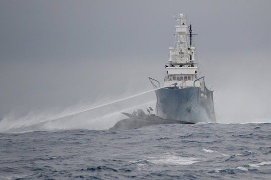 負(fù)責(zé)捕鯨任務(wù)的日本鯨類研究所指責(zé)“海上牧者”試圖以快艇高速接近、拋擲繩索的方式絞住捕鯨船的推進(jìn)器。