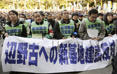 現(xiàn)行計(jì)劃中的搬遷地點(diǎn)、沖繩縣名護(hù)市新當(dāng)選的市長稻嶺進(jìn)也向集會(huì)發(fā)來了表達(dá)共同愿望的信息。市民團(tuán)體“直升機(jī)基地反對協(xié)議會(huì)”的共同代表安次富浩表示:“鳩山由紀(jì)夫首相說將把名護(hù)市長選舉的結(jié)果作為判斷材料,我們?nèi)〉昧藙倮。沒有比這更能代表民意的了!