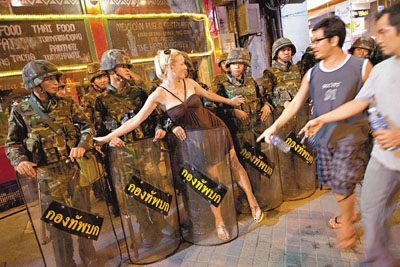 數(shù)以百計的士兵配備了M-16機(jī)關(guān)槍,在商業(yè)區(qū)中心地帶Silom路進(jìn)行巡邏,密切關(guān)注路口對面的示威者動向,那些示威者已經(jīng)集結(jié)了鋒利的竹杖,用卡車輪胎搭起路障。