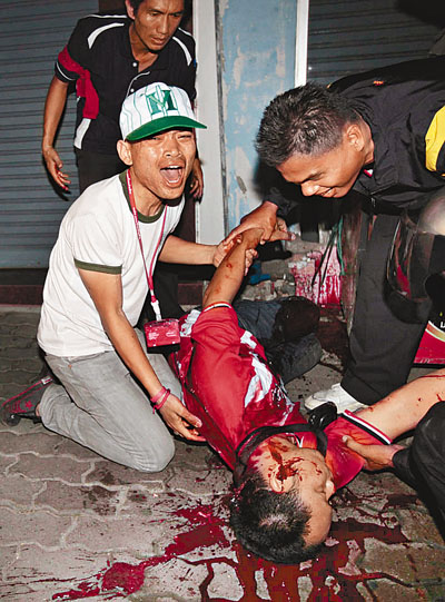 納塔武對記者說:“阿披實(shí)已為內(nèi)戰(zhàn)揭開序幕了。我們緊急要求政府撤軍,停止一切暴力行為。如果阿披實(shí)不同意;,我不知道我們能否活過今晚。我們希望阿披實(shí)不想要戰(zhàn)爭。”