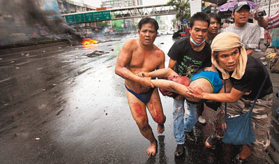 紅衫軍集會(huì)地點(diǎn)附近昨繼續(xù)傳出斷續(xù)的槍聲和爆炸聲,示威者焚繞車胎作路障,一間商店起火,一間7.11便利店被搶掠糧水,盤(pán)谷銀行一間分行前晚亦發(fā)生爆炸。數(shù)百紅衫軍上周六起在工人活躍的孔堤港聚集,企圖分散軍方在商業(yè)區(qū)的注意力,開(kāi)辟新戰(zhàn)場(chǎng)。