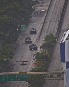 軍方擴(kuò)大了對(duì)紅衫軍聚集區(qū)的封鎖范圍,并使用擴(kuò)音器呼吁在這一區(qū)域內(nèi)的所有人返家。昨晚有傳聞軍方將展開(kāi)清場(chǎng)行動(dòng),今晨仍能聽(tīng)到零星槍聲。