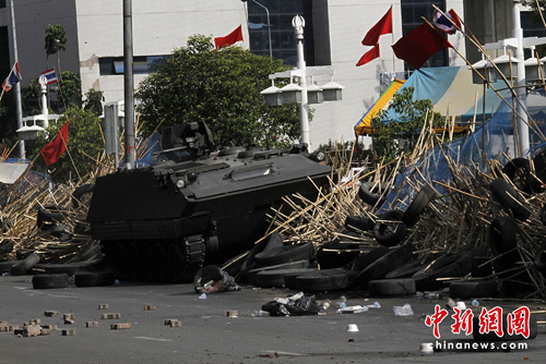 中新網(wǎng)5月19日電 據(jù)外電報(bào)道,19日泰國軍方對(duì)聚集在首都曼谷市示威的反政府“紅衫軍”展開了驅(qū)散行動(dòng),據(jù)信軍方裝甲車已突破“紅衫軍”所筑路障,且至少有3人被槍擊中。